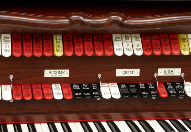 The R-10, 28 Stop, Two-manual organ is equipped with Allen's efficient LED stop controls.