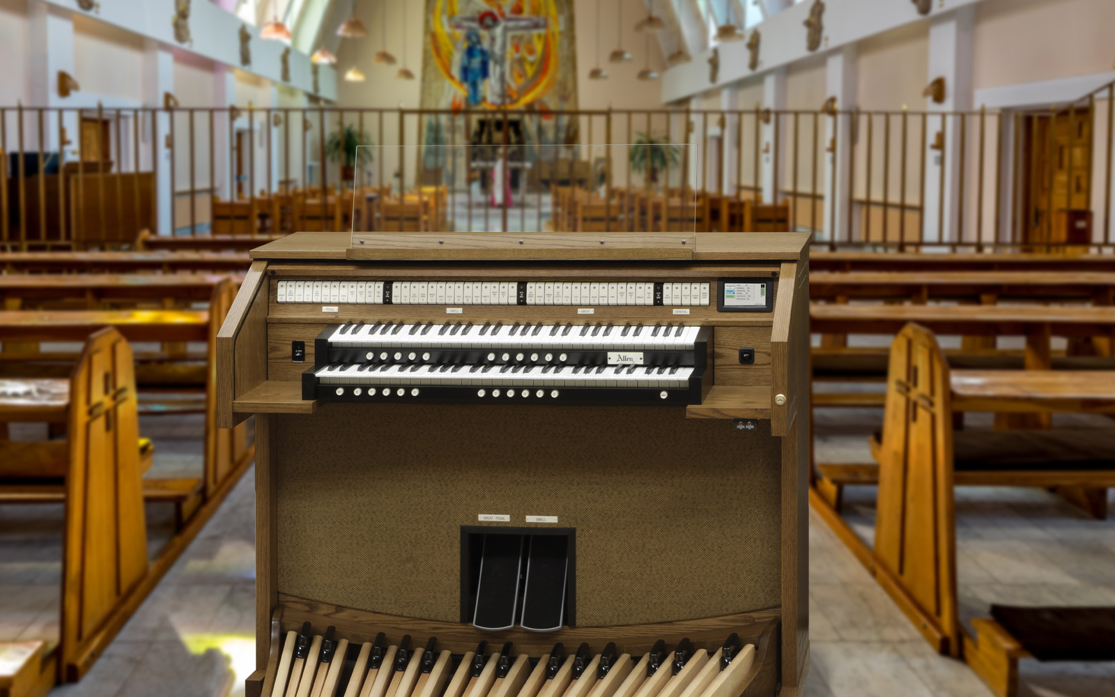 Allen introduces Real Xpression™ technology. This exclusive feature enables Allen Organs' expression shoes to interact with the organ sounds and react the same way as a pipe organ would with Swell shades.