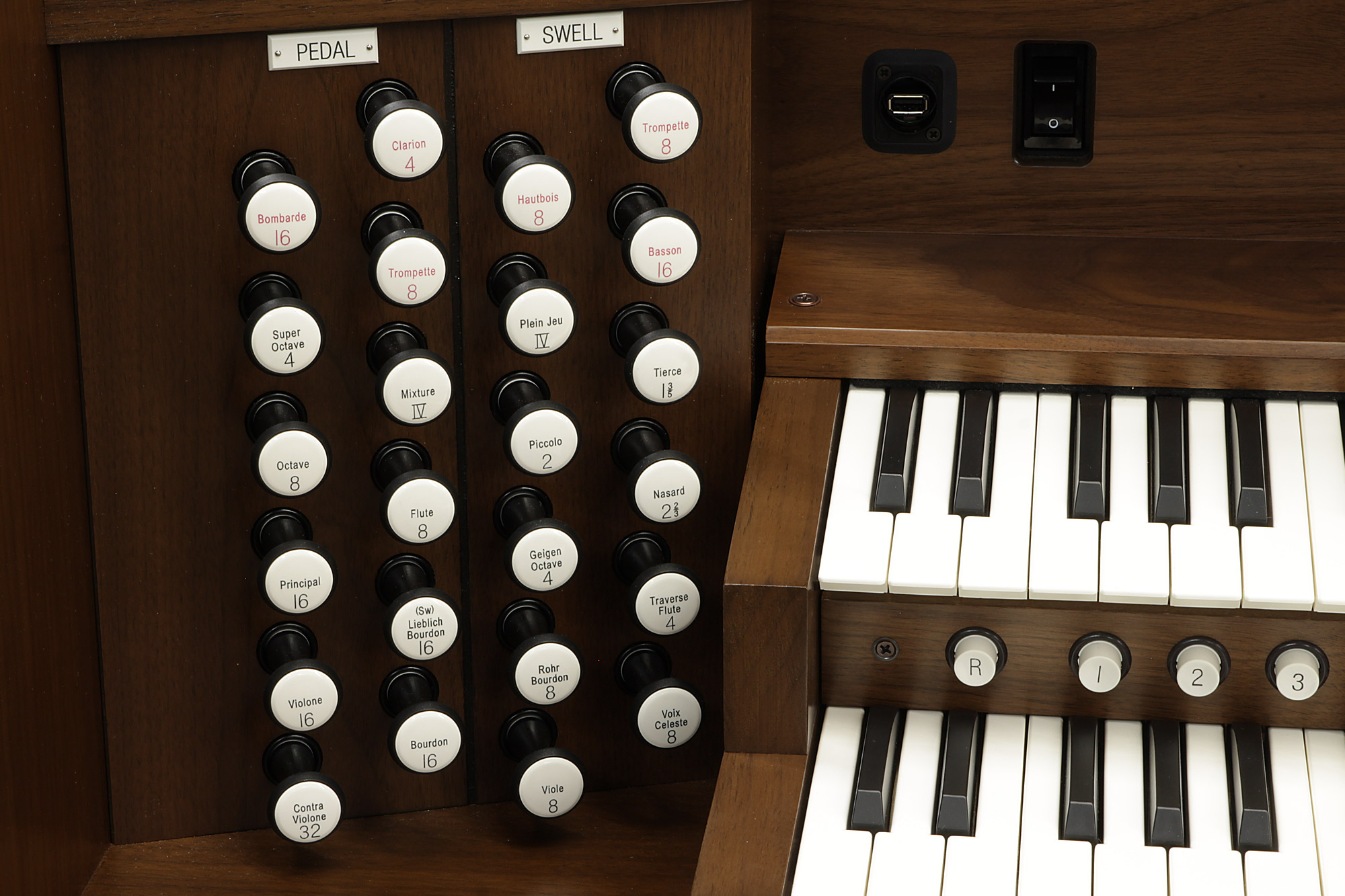 The R-10, 28 Stop, Two-manual organ is equipped with Allen's efficient LED stop controls.