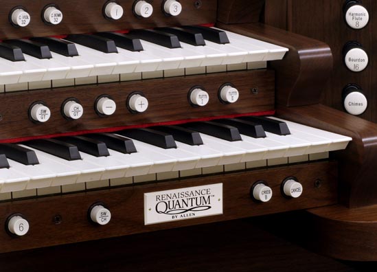 This walnut-finish, Three-Manual Quantum™ instrument is scheduled for installation in Saratoga Springs, New York. It includes Allen's Interlaced Audio™ and "Praise Package" with EAC™ (Expanded Audio Capabilities), OST™ Keying and Allen Vista Navigator™.