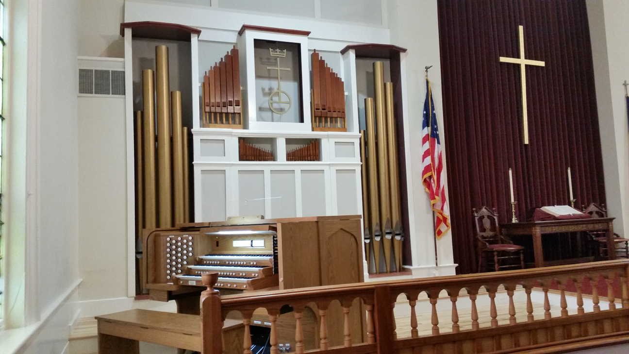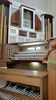 The instrument was placed in the front of the church, and the moveable console can be connected in multiple locations, allowing for either worship or concert use.