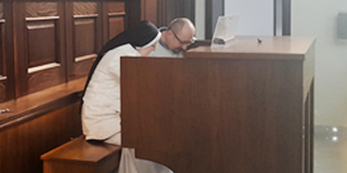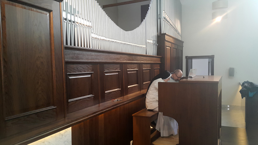 Allen Representative Jacek Kuchckik demonstrating to Sister Wojciecha the new parish Allen organ. |