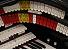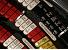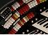 Pedalboard: black sharps and maple naturals; expression nameplates mounted on pedalboard